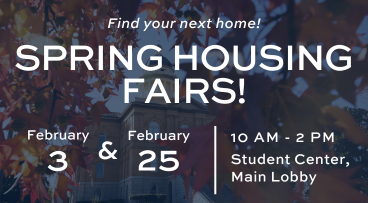 University Housing is hosting two housing fairs this spring to help you make a more informed decision about off-campus housing! Several local off-campus properties will be available to answer your questions. Goodies and giveaways too!